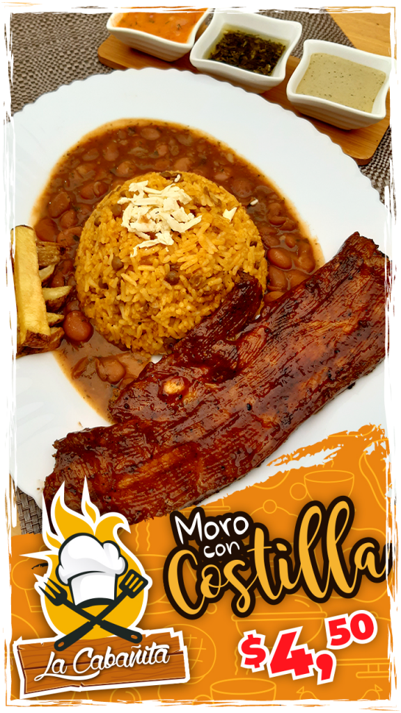 Te invitamos a probar nuestro delicioso moro semicremoso acompañado de una rica costilla de cerdo o pollo asados a la parrilla y por su puesto con las salsas de la casa